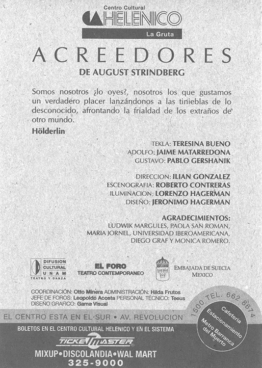 Acreedores surge de los ejercicios de dirección de escena impartidos por el maestro Ludwik Margules en el Foro de la Ribera. Con ésta pieza Strindberg crea un discurso alrededor del amor vampírico, mostrando el intercambio en las relaciones de pareja como una lucha constante de poder. El amor se presenta con rasgos de canibalismo psicológico, evidenciando que odio, pasión y adoración conviven en los mismos espacios.