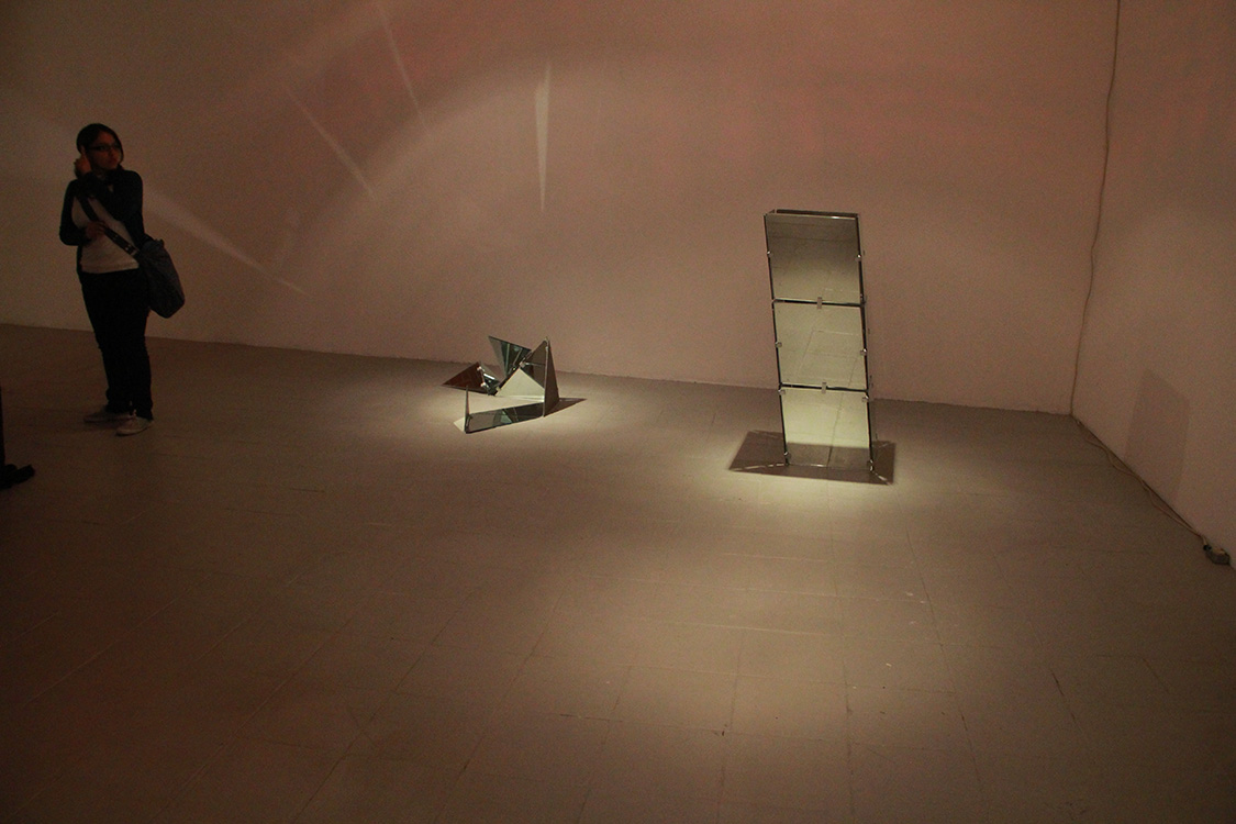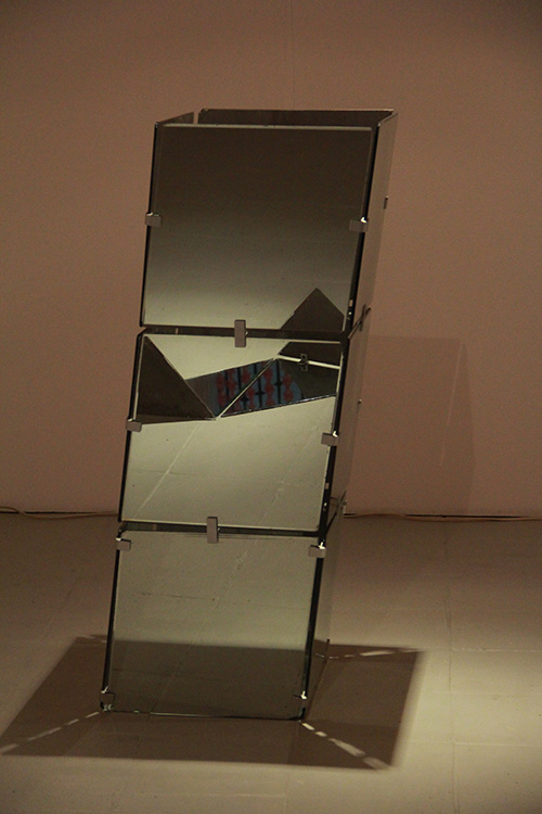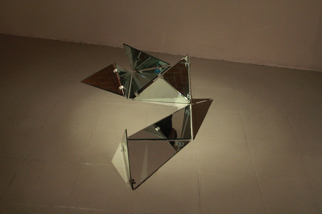 Trabajé alrededor de la idea de fragilidad y tensión, utilizando 24 piezas de espejos encontrados durante la remodelación una vieja casa de los cincuenta en la colonia Narvarte. Los espejos de formas triangulares y romboides muestran en ellos las huellas del tiempo (fisuras, manchas, desgastes) que hacen de la figura geométrica pura, un objeto imperfecto. El espejo viejo refleja una especie de fantasma; su nebulosidad recuerda casi dolorosamente la nitidez que un día tuvo.